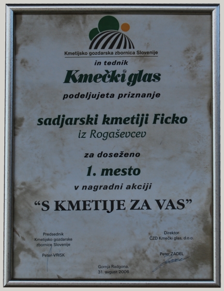 Ponosni smo tudi na to, da smo uspeli na ve kot desetletje trajajoi akciji Kmetijsko – gozdarske zbornice in revije Kmeki glas osvojiti prvo mesto kot perspektivna sadjarska kmetija v akciji S KMETIJE ZA VAS.