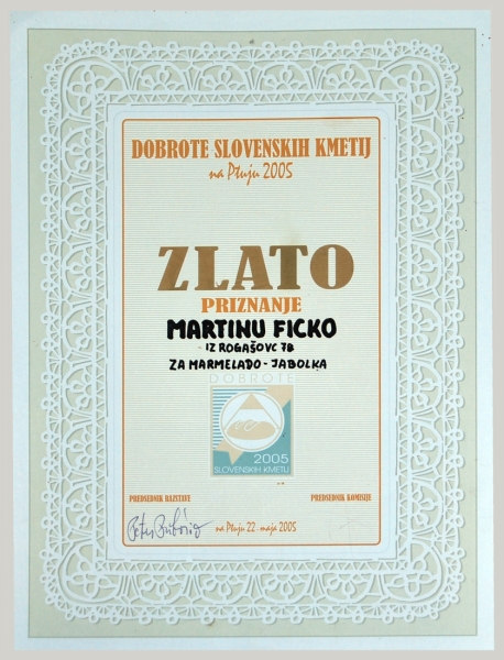 Kljub temu da se ukvarjamo s predelavo sadja šele nekaj let, smo za naše izdelke prejeli e kar nekaj zlatih, srebrnih in bronastih priznanj na razlinih domaih in mednarodnih ocenjevanjih.